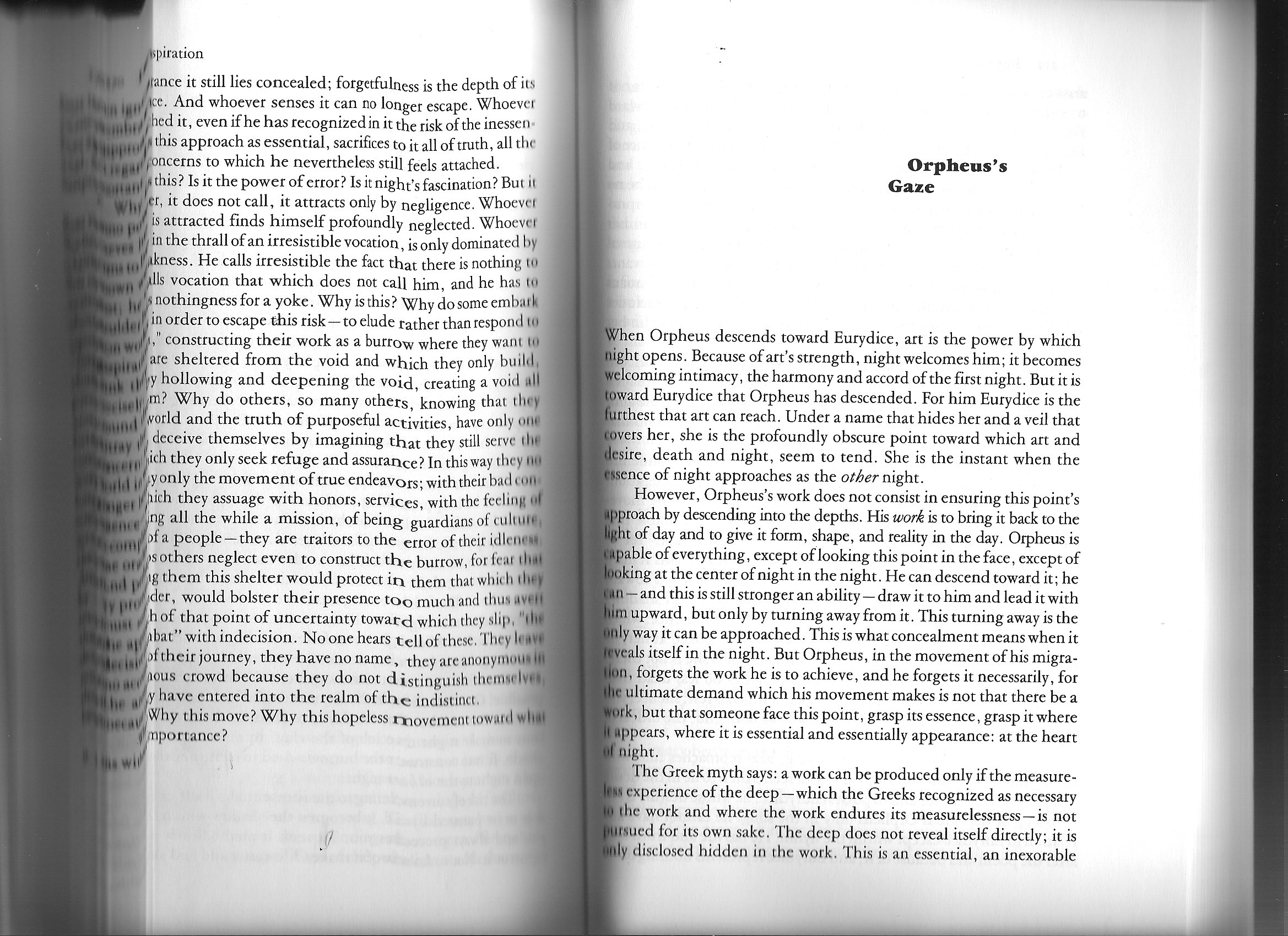 Quand Orphée descend vers Eurydice, l’art est la puissance par laquelle s’ouvre la nuit. La nuit par la force de l’art, l’accueille, devient l’intimité accueillante, l’entente et l’accord de la première nuit. Mais c’est vers Eurydice qu’Orphée est descendu : Eurydice est, pour lui, l’extrême que l’art puisse atteindre, elle est, sous un nom qui la dissimule et sous un voile qui la couvre, le point profondément obscur vers lequel l’art, le désir, la mort, la nuit semblent tendre. Elle est l’instant où l’essence de la nuit s’approche comme l’autre nuit.